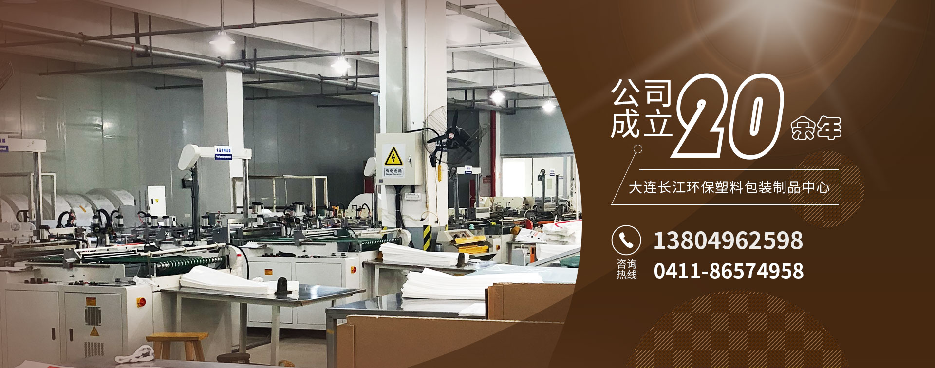 大連長江環保塑料包裝制品中心專業生產各種PP、PO、PPE、OPP塑料袋。環保及防靜電材料的工業包裝袋。食品裝、復合袋、制衣廠各種平掛、斜掛、信封膠貼袋及平口袋。商場購物袋、自封袋(骨袋)、卡頭袋、叉耳袋、手挽袋、廣告袋、禮品袋、氣泡袋、手工袋、大號垃圾袋等。布商標、不干膠加工。